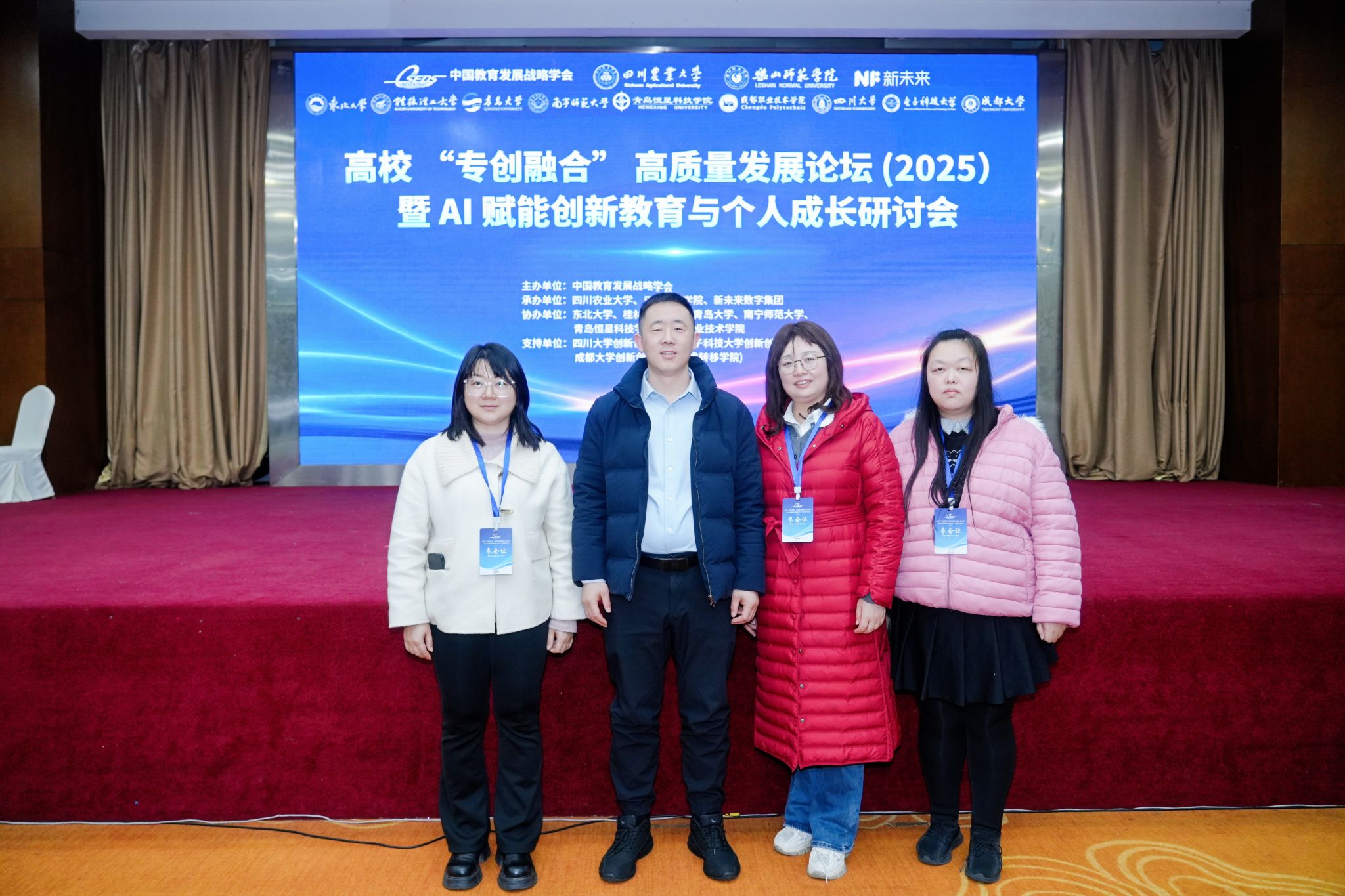 12月6日-8日,高校“专创融合”高质量发展论坛(2025)暨AI赋能创新教育与个人成长研讨会在成都成功举办。本次论坛由中国教育发展战略学会主办,四川农业大学、乐山师范学院、新未来数字集团承办,国内多所高校及创新创业学院协办与支持。实验室教师刘敏作为学校创新创业指导教师代表应邀参会,与来自全国85所高校的280余位来宾共同探讨人工智能时代下创新教育的发展路径与个人成长机制。